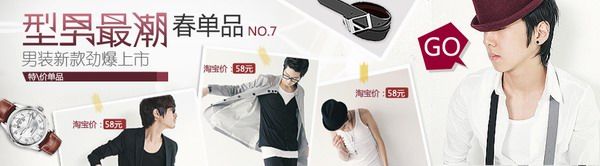 6例是男裝的banner設(shè)計,大家在設(shè)計男裝時可以很好的妙用直線條,因為直線條是最好表現(xiàn)男性特征的一個設(shè)計元素。在生活中不難看見直線是眾多的男性品牌logo設(shè)計的根本元素。