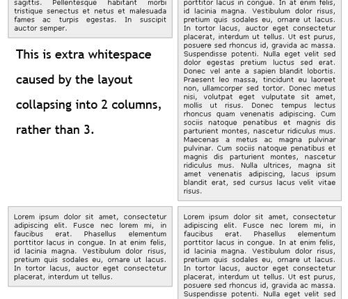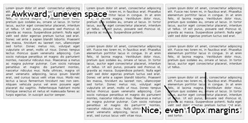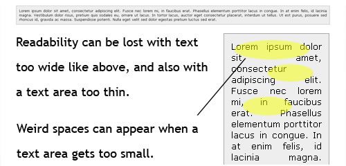 另外一個(gè)流動(dòng)布局關(guān)注的常見問題是:文本要么伸展要么擠壓以致失去了可讀性。下面的這張圖片表明了這個(gè)問題,無(wú)論是在大屏幕還是在小屏幕上都是一樣,在小屏幕上似乎問題更大--文本間隙太大,上面這些情況都令用戶沮喪。