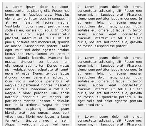 不去考慮不斷改變屏幕分辨率時(shí)css中的存在的許多問題。倒有一個(gè)共同的問題是許多設(shè)計(jì)師更可能面臨的--多重內(nèi)容盒子。當(dāng)有許多浮動(dòng)元素時(shí),一些尷尬的空白會(huì)出現(xiàn)在高度變換的區(qū)域之間,下面是這方面的一個(gè)例子: