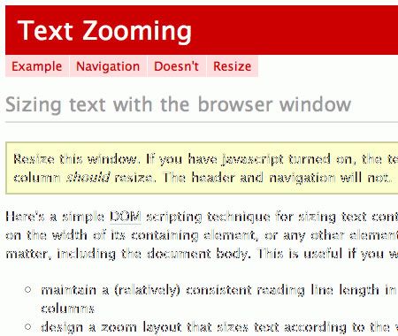 要看實(shí)際效果,可以到他的Text Zooming page. 頁(yè)。正如你所看到的那樣,腳本很好的退化,在較大分辨率屏幕上大文本容易閱讀,就像在小屏幕上小文本易于閱讀一樣。更重要的是,標(biāo)題和導(dǎo)航并不改變大小,所以元素可以決定那個(gè)元素應(yīng)當(dāng)使用文本縮放。