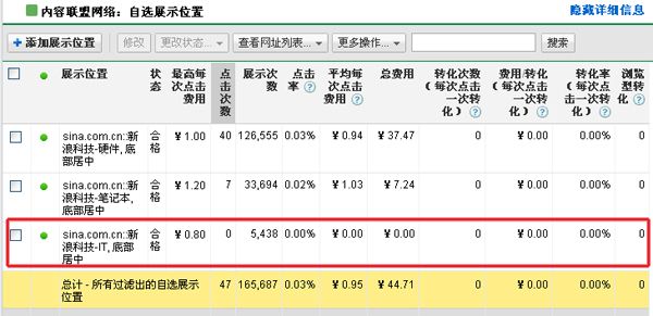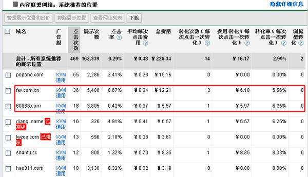 如果您啟用了Google Adwords轉化跟蹤工具,您也可以看到每個站點對應的轉換數(shù)據(jù)。我們可以根據(jù)每次轉換成本來評估媒介的質量。但是Google Adwords轉化跟蹤如果配置不合理可能會嚴重影響對媒介質量的判斷,依靠谷歌分析來分析流量質量會更可靠一些。