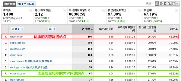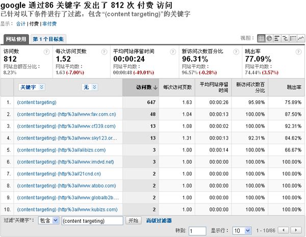 我們可以通過幾個重要指標來評估內容站點的質量(平均停留時間、跳出率、KPI轉換率),排除流量質量和KPI轉換效果較差的站點,添加新的相關內容網(wǎng)絡站點。不斷執(zhí)行優(yōu)化的過程中,您可能會驚喜的發(fā)現(xiàn)您的廣告投資回報率在不斷增長。 如果您的Google Adwords帳戶已經(jīng)和谷歌分析(Google Analytics)帳戶鏈接整合,那么您可以通過谷歌分析報表數(shù)據(jù),分析出以網(wǎng)站定位廣告系列中的所有站點的質量。
