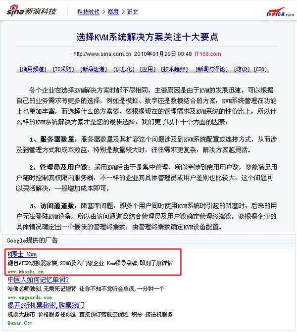 谷歌內容廣告關鍵字匹配機制,是對細分群體定位的關鍵設置。(設置關鍵字匹配機制前,您一定要先了解您目標客戶的關注點) 如果您設置過多的關鍵詞,那很有可能很多潛在的客戶根本無法看到你的廣告;如果您設置的關鍵詞太少,會影響匹配的精確性。在上面的圖示中,我們可以看到新浪上”KVM”相關的文章,匹配到K博士這組廣告。如果有許多競爭對手同時也投放到此網(wǎng)站,并且也是定義的”KVM”關鍵詞,在出價相同的條件下,K博士這組廣告毫無優(yōu)勢可言,但是如果我們定義2個關鍵詞”KVM”+”解決方案” 那么在這組頁面中我們的廣告相關性就更高,在出價相同的條件下,我們可以獲得更多的展示機會。