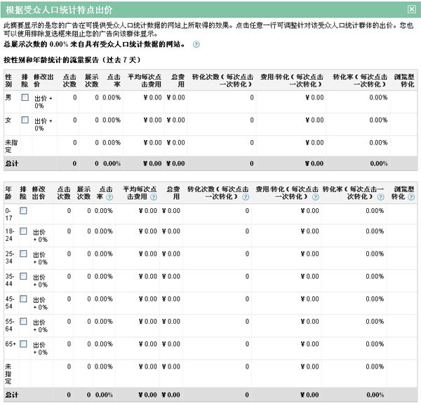 谷歌內容網(wǎng)絡最具特色的一個功能,針對群體性別和年齡來定位,我們可以排除一些不可能使用我們產(chǎn)品的群體,還可以針對不同的群體設定不同的出價比例。 例如:我們在推廣一款網(wǎng)站分析監(jiān)測的產(chǎn)品,這部分群體大部分都是WA分析師在使用,群體大致在25~34歲之間,那么我們可以將此年齡群體的出價提升10%,這個群體類型的用戶將會有更多幾率看到我們的內容網(wǎng)絡廣告。 這個功能準確性有待驗證!