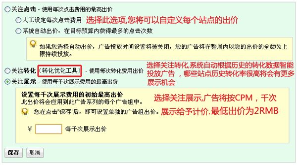 通常我們選擇”人工設定每次點擊費用”即可! 如果我們投放的站點廣告點擊率非常之高,或者我們投放站點競爭對手廣告非常多,那么我們可以考慮采用千次展示費用出價,盡可能獲得更多的展示機會。總之您可以嘗試不同的出價模式,看哪種模式投資回報率更高了! 按照展示來出價的選項必須要啟動谷歌ADWORDS轉換優(yōu)化工具,才可以使用!系統(tǒng)會根據(jù)歷史轉換來智能投放,歷史轉換高的站點有更高的展示機會,此選項不建議新手使用。我曾經(jīng)嘗試過使用此選項,但是轉化效果遠不如使用“人工設定每次點擊費用”選項配置。