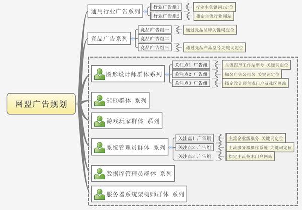 以上的規(guī)劃結(jié)構(gòu)圖,只是舉了一個(gè)典型的示例。實(shí)際投放中都可以做靈活部署。主要分為三個(gè)主要部分,1、行業(yè)廣告系列:使用行業(yè)通用關(guān)鍵詞去匹配廣告,當(dāng)然如果在指定網(wǎng)站的條件下使用關(guān)鍵詞去匹配網(wǎng)盟廣告,精確度會(huì)更高。 2、競品廣告系列: 試想如果所有和競品相關(guān)的內(nèi)容都出現(xiàn)我們的廣告,想必會(huì)導(dǎo)入許多競爭對(duì)手的用戶群體。 3、目標(biāo)群體廣告系列:針對(duì)每個(gè)細(xì)分群體的關(guān)注點(diǎn)來做網(wǎng)盟投放,針對(duì)性會(huì)更強(qiáng)。這種規(guī)劃能在保證用戶覆蓋率的條件下更精準(zhǔn)的將網(wǎng)盟廣告推送到目標(biāo)群體!我們還可以借助第三方的目標(biāo)群體定位來做廣告覆蓋,例如:”橘子酒店” 的主要目標(biāo)群體都是設(shè)計(jì)師群體,我們完全可以借助網(wǎng)盟平臺(tái)覆蓋許多關(guān)注橘子酒店的群體!
