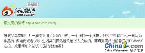 百度出于自身發(fā)展考慮終止與網(wǎng)址站的合作讓部分導(dǎo)航站站長叫苦不已,據(jù)搖籃網(wǎng)運(yùn)營主管廖文亮先生在微博透露,導(dǎo)航站的廣告投放費(fèi)用均有所上漲。