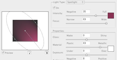 首先創(chuàng)建一個漂亮的背景。新建一個ps文檔,背景填充為黑色(D→Alt+Delete)。創(chuàng)建一個新圖層(Ctrl+Alt+Shift+N)并填充為白色(D→Ctrl+Delete)。下面將用“光照效果”濾鏡(濾鏡》渲染》光照效果)在這層上制作柔美的漸變效果。在強(qiáng)度調(diào)節(jié)旁邊,選擇你喜歡的任意顏色只要有一些深的顏色就可以。比如,我選擇了深粉色/紫色。