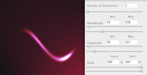 從這步開始變的很有意思。有兩個濾鏡可以使光效變的像光紋:波浪(濾鏡》扭曲》波浪)和(濾鏡》扭曲》旋轉(zhuǎn)扭曲)。用波浪可以制作各式各樣不規(guī)則的紋路。像其他濾鏡一樣,可以調(diào)節(jié)滑塊來取得理想的效果。但是或許應(yīng)該適當(dāng)調(diào)大波長和波幅。同樣,試著在同一圖層多次運用“波浪” 濾鏡。
