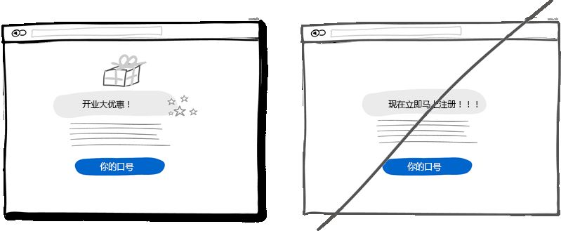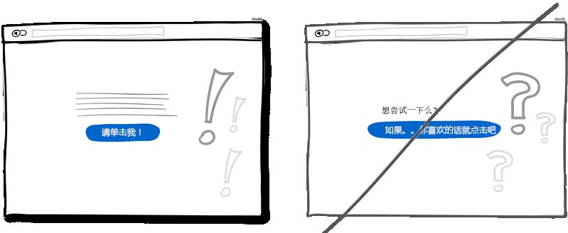 你可以通過(guò)不確定而顫抖的聲音來(lái)表達(dá)傳遞自己的意思,當(dāng)然也可以通過(guò)很自信的方式表達(dá)。如果你在界面中的表述用語(yǔ)多以問(wèn)號(hào)結(jié)束,比如"也許","可能","感興趣?" 或者"想要試試么?",那么你完全還可以把語(yǔ)氣變得更堅(jiān)定一些。不過(guò)萬(wàn)事無(wú)絕對(duì),或許適當(dāng)放松措詞讓用戶(hù)有自行思考的余地也是可以的。