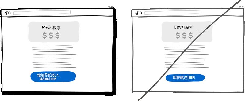 試想界面上有這樣兩個(gè)按鈕:一個(gè)是"獲取折扣",另一個(gè)是"立即注冊(cè)"。我敢打賭大多數(shù)人會(huì)點(diǎn)擊第一個(gè),因?yàn)榈诙€(gè)按扭讓人感覺(jué)不到有利可圖,并且"注冊(cè)"讓人聯(lián)想到填不完的表單。也就是說(shuō)讓用戶(hù)感受到獲利的按鈕更有可能被點(diǎn)擊。這種讓用戶(hù)感到好處的文字信息也可是放在按鈕旁邊,不一定要做為按鈕的標(biāo)題。當(dāng)然,正常的按鈕還是有用處的,一般用于重復(fù)性操作頻繁的地方。
