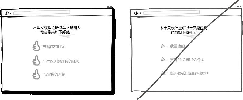 市場(chǎng)就是這樣的,用戶(hù)永遠(yuǎn)只關(guān)心自身利益而產(chǎn)品特性對(duì)他們來(lái)說(shuō)倒不是那么重要。只有利益才更直觀地體現(xiàn)出使用產(chǎn)品所帶來(lái)的價(jià)值。Chris Guillebeau在他的著作《100美元起家》中指出,相比壓力,沖突,煩心事和未知的未來(lái),人們?cè)诤醯酶嗟氖菒?ài),金錢(qián),認(rèn)同感和自由支配的空閑時(shí)間。所以我相信在展示產(chǎn)品特性時(shí)回歸到利益上是必要的。
